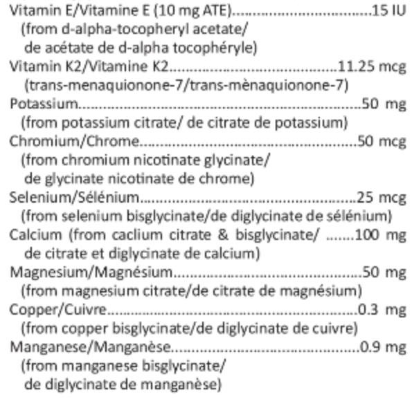 Ingrédients médicinaux / Scoop:Vitamine A (300 mcg EAR) (du palmitate de vitamine A) 1 000 UI*Mélange de caroténoïdes (d'Elaeis guineensis) - 450 mcgVitamine B1 (du chlorhydrate de thiamine) - 1,2 mgVitamine B2 (du riboflavine-5-phosphate (sel de sodium)) - 0,65 mgVitamine B3 (niacinamide) - 5 mgVitamine B5 (du d-pantothénate de calcium) - 10 mgVitamine B6 ( pyridoxal-5-phosphate) - 1,75 mgVitamine B12 (méthylcobalamine) - 50 mcgFolate (du calcium 6S-L-5-méthylfolate) - 200 mcgBiotine - 100 mcgVitamine C (acide ascorbique) - 100 mgVitamine D3 (2,5 mcg) (cholécalciférol) 100 UI*Vitamine E (10 mg ATE) (de l'acétate de d-alpha-tocophérol) 15 UI*Vitamine K2 (trans-menaquinone-7) - 11,25 mcgPotassium (du citrate de potassium) - 50 mgChrome (du glycinate de nicotinate de chrome (III)) - 50 mcgSélénium (du bisglycinate de sélénium) - 25 mcgCalcium (du bisglycinate et du citrate de calcium) - 100 mgMagnésium (à partir du citrate de magnésium) - 50 mgCuivre (du bisglycinate de cuivre) - 0,3 mgManganèse (du bisglycinate de manganèse) - 0,9 mgMolybdène (du bisglycinate de molybdène) - 12,5 mcgZinc (du gluconate de zinc) - 2,5 mgIode (de l'iodure de potassium) - 60 mcgL-Lysine - 225 mg L-Glutamine - 250 mgL-Glycine - 750 mgL-Taurine - 150 mgN-acétyl-L-cystéine - 50 mgBétaine - 20 mgCholine (à partir de bitartrate de choline) - 20 mgMéthylsulfonylméthane (MSM) - 50 mgInositol - 25 mgCurcumine (C3-Complex) (de Curcuma longa) (racine, rhizome) - 125 mgQuercétine (isolat) (de Sora japnoica) (fleur) - 25 mg