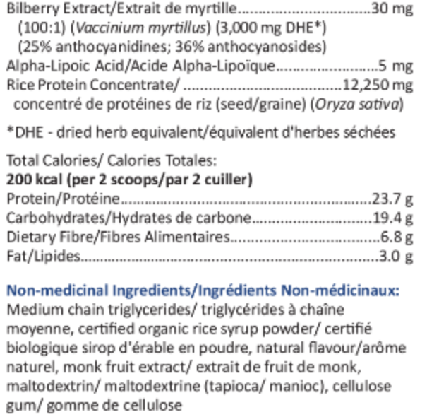 Extrait de bardane (15:1) (Arctium lappa) (racine) (équivalent à 750 mg d'herbe séchée) - 50 mgExtrait de romarin (10:1) (Rosmarinus officinalis) (feuille) (équivalent à 75 mg d'herbe séchée) - 7,5 mgExtrait de menthe poivrée (20:1) (Mentha piperita) (feuille) (équivalent à 600 mg d'herbe séchée) - 30 mgExtrait de myrtille (100:1) (Vaccinium myrtillus) (25 % anthocyanidines ; 36 % anthocyanosides) (équivalent à 3 000 mg d'herbe séchée) - 30 mgAcide alpha-lipoïque - 5 mgConcentré de protéines de riz (graine) (Oryza sativa) - 12 250 mg*UI - Unité Internationale