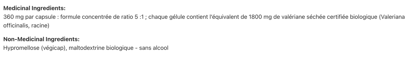 Ingrédients médicinaux:360 mg par capsule : formule concentrée de ratio 5 :1 ; chaque gélule contient l’équivalent de 1800 mg de valériane séchée certifiée biologique (Valeriana officinalis, racine)