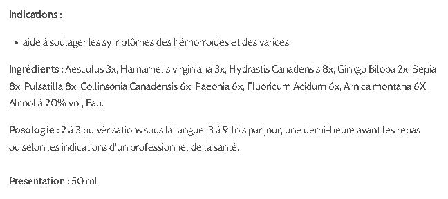 Ingrédients : Aesculus 3x, Hamamelis virginiana 3x, Hydrastis Canadensis 8x, Ginkgo Biloba 2x, Sepia 8x, Pulsatilla 8x, Collinsonia Canadensis 6x, Paeonia 6x, Fluoricum Acidum 6x, Arnica montana 6X, Alcool à 20% vol, Eau.