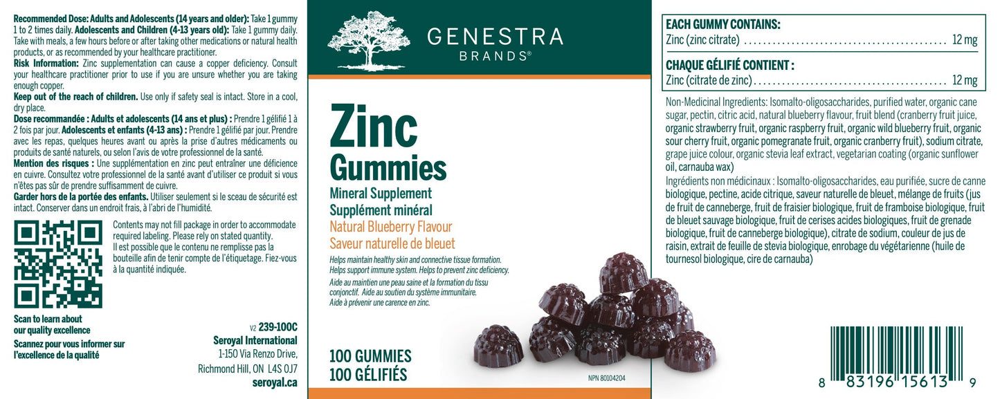 Le produit Zinc Gummies contient 12 mg de zinc élémentaire sous forme de citrate de zinc par gélifié et il convient aux personnes de 4 ans et plus. C’est une délicieuse option qui aide à satisfaire les besoins quotidiens en zinc. Le zinc est un oligoélément essentiel dans l’organisme. Il joue un rôle essentiel dans le maintien du système immunitaire en stimulant la production des cellules immunitaires, en régulant l’activité des cellules NK et en médiant la production des cytokines. La recherche clinique a démontré que la prise quotidienne de suppléments de zinc aide à soutenir la santé immunitaire des adultes, des adolescents et des enfants. Le zinc est aussi utilisé depuis longtemps en dermatologie. Il contribue à la santé immunitaire de la peau tout en favorisant la synthèse du collagène pour le maintien de la structure de la peau. De plus, le zinc contribue à la santé des cheveux et des ongles et favorise la santé des os par la régulation de la formation et la résorption osseuses. Ce minéral joue aussi un rôle dans un système tampon essentiel au maintien d'un équilibre acido-basique normal. Le produit Zinc Gummies se présente sous la forme de délicieux gélifiés à la saveur naturelle de bleuet qui ne contiennent aucun colorant ni arôme artificiel et sont faibles en sucre. Avec seulement un gélifié par jour, cette formule aide à prévenir les carences en zinc et elle soutient le système immunitaire. Zinc Gummies est le produit idéal pour les personnes de 4 ans et plus qui ont de la difficulté à avaler des capsules.